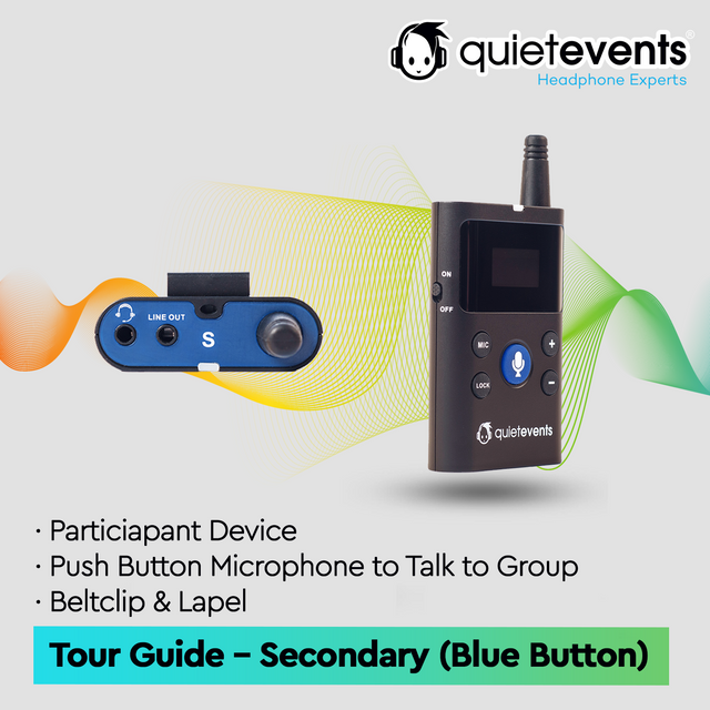 The Secondary/Participant device has two ports, a Line out and a Headphone jack. Participants can only listen to the guide if the wire is plugged into the line out. If the wire is plugged into the microphone icon port, everyone can hear it when they press the blue button.
